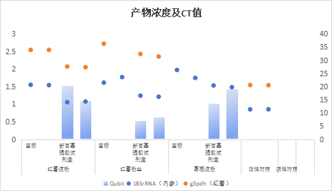 产品应用:100mg红薯淀粉、红薯粉丝粉末、葛根淀粉分别用SN/T 5522 《食用淀粉植物源成分鉴别方法 实时荧光PCR法》方法和新百基食用淀粉及其制品DNA提取试剂盒进行提取。使用Qubit检测提取产物浓度,并分别用植物内参照引物探针和红薯特异性的引物探针进行PCR扩增。