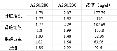 产品应用:分别称取肝脏组织,肾脏组织,果蝇成虫、蟑螂腿各20mg液氮研磨后样本进行提取。